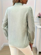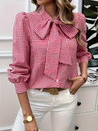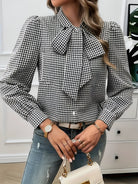 تتميز هذه البلوزة بنمط مربعات خالد مزين بتفصيل عقدة أنيقة. تجعلها الأكمام الطويلة مثالية لجميع الفصول. سهلة التنسيق، تناسب المناسبات غير الرسمية والمهنية على حد سواء.