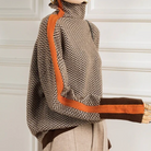 Dieser Pullover hebt eine strukturierte Linie durch sein aufwendiges Zickzackmuster hervor. Die kontrastierenden Streifen entlang der Ärmel fügen eine markante visuelle Note hinzu, ohne übertrieben zu wirken. Sein leicht lockerer Schnitt ermöglicht es, mühelos Alltags- oder schickere Outfits zu kombinieren.