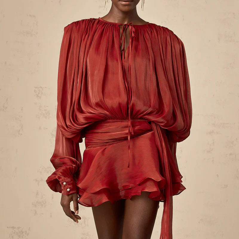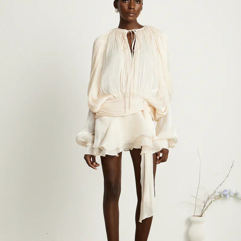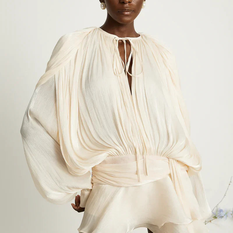 Αυτή η μίνι-φορεσιά συνδυάζει μια άνετη γραμμή με ρευστά μανίκια για ένα στυλ ταυτόχρονα άνετο και εκλεπτυσμένο. Ο πολυλειτουργικός σχεδιασμός της προσαρμόζεται σε διάφορες περιστάσεις, προσφέροντας μια κολακευτική σιλουέτα. Ο λεπτός σύνδεσμος στον λαιμό προσθέτει μια επιπλέον θηλυκή πινελιά.