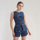 This set includes a structured sleeveless vest with gold buttons and front pockets. The high-waisted shorts offer a flattering cut and optimal comfort.