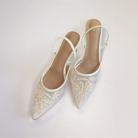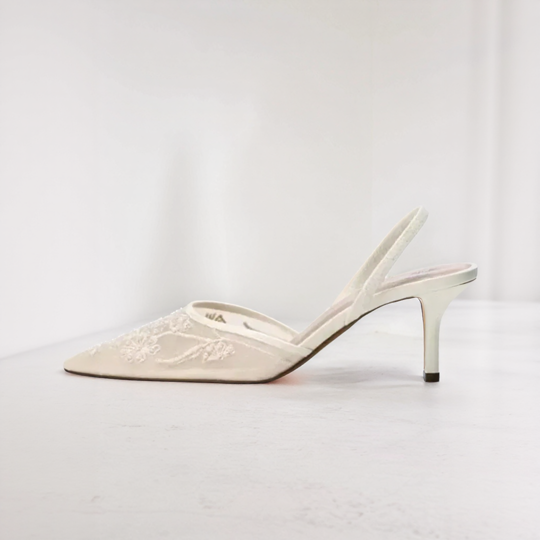 Nämä korkokengät erottuvat hienolla kukkakirjonnalla tukevalla, kevyellä ja läpinäkyvällä päällisellä. Niiden teräväkärkinen muotoilu pidentää siluettia elegantisti, kun taas säädettävä remmi varmistaa tukevan istuvuuden ja tuo hienostuneen lisän.