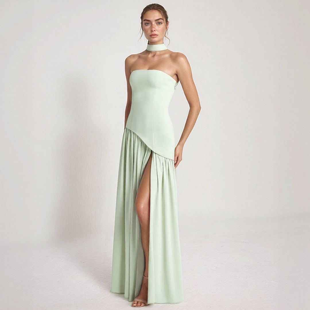Tämä pitkä mekko korostaa siluettia rakenteellisen ja olkaimettoman korsetin ansiosta. Sivuhalkio tuo ripauksen naisellisuutta ja itseluottamusta. Ihanteellinen elegantteihin iltoihin, se yhdistää viehätysvoiman ja mukavuuden.