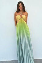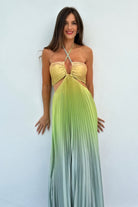 השמלה הארוכה המופיעה יוצרת דמות זורמת ונשית באופן טבעי. הצווארון האמריקאי מדגיש את הכתפיים בעדינות. הקפלים מוסיפים נופך של עידון לכל המראה.