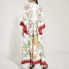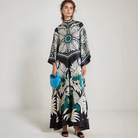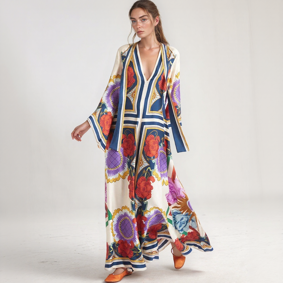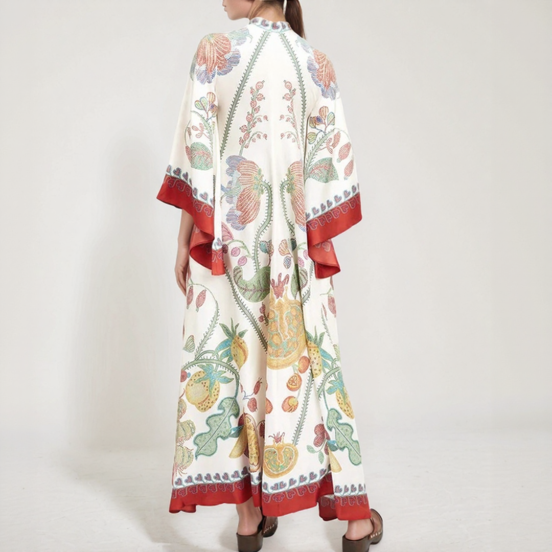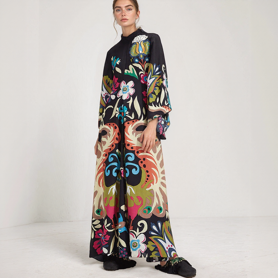 Questo abito lungo presenta audaci motivi floreali e una silhouette fluida. Il suo colletto alto con dettaglio a nodo sul retro aggiunge un tocco sofisticato. Perfetto per tutte le stagioni, offre un'eleganza bohemienne senza tempo.