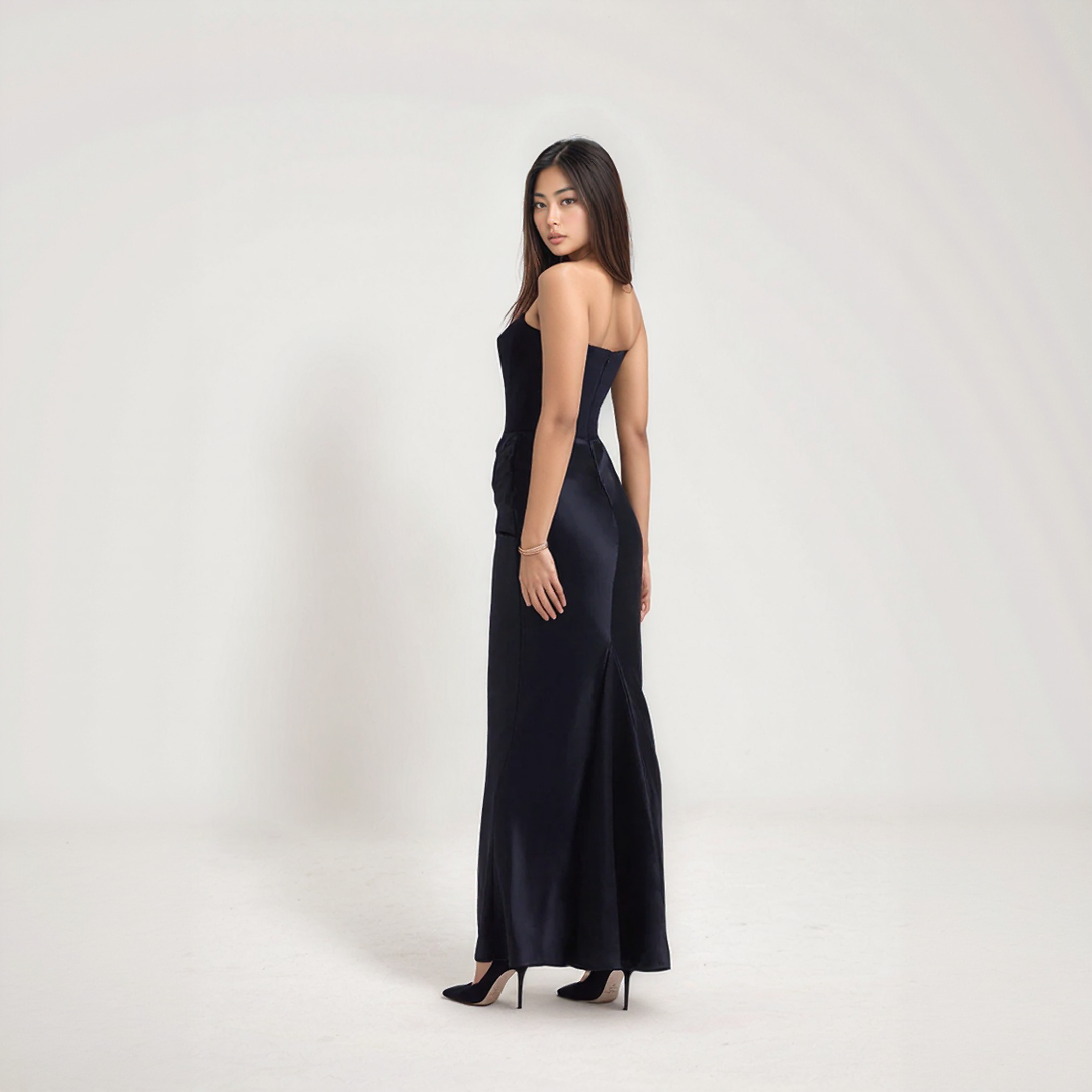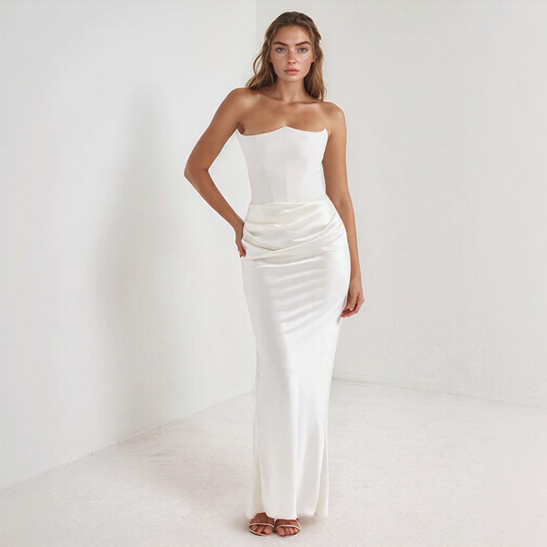 Questo abito corsetto elegante valorizza la silhouette grazie al suo top strutturato. Il suo design senza spalline e la sua linea fluida conferiscono un tocco di sofisticatezza naturale. Ideale per serate eleganti e occasioni formali.