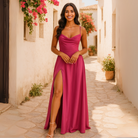 Questo abito lungo senza maniche incarna la femminilità con raffinatezza. La sua silhouette valorizza le spalle, mentre la gonna fluida con spacco accompagna ogni movimento con eleganza. Morbido al tatto e piacevole da indossare, è adatto sia per serate eleganti che per momenti più informali.