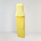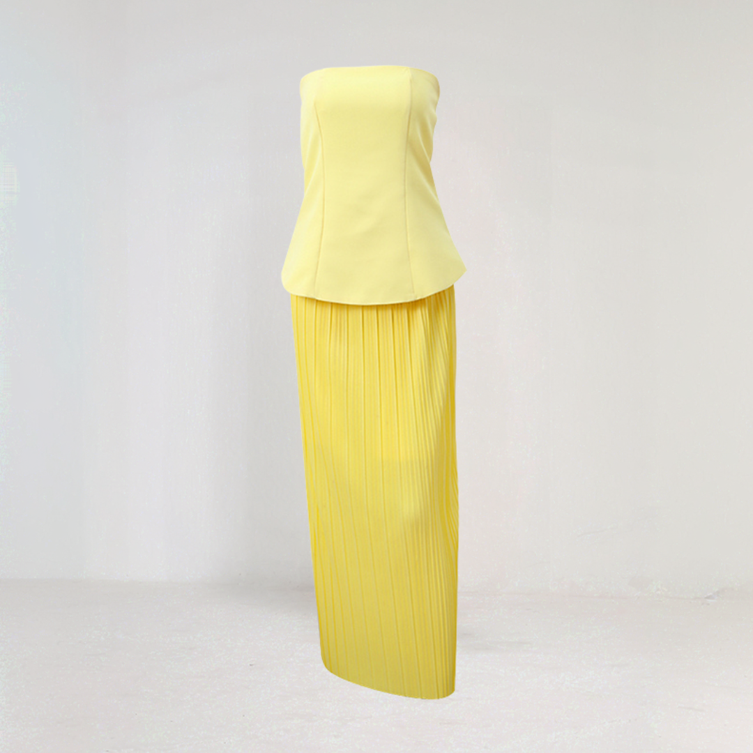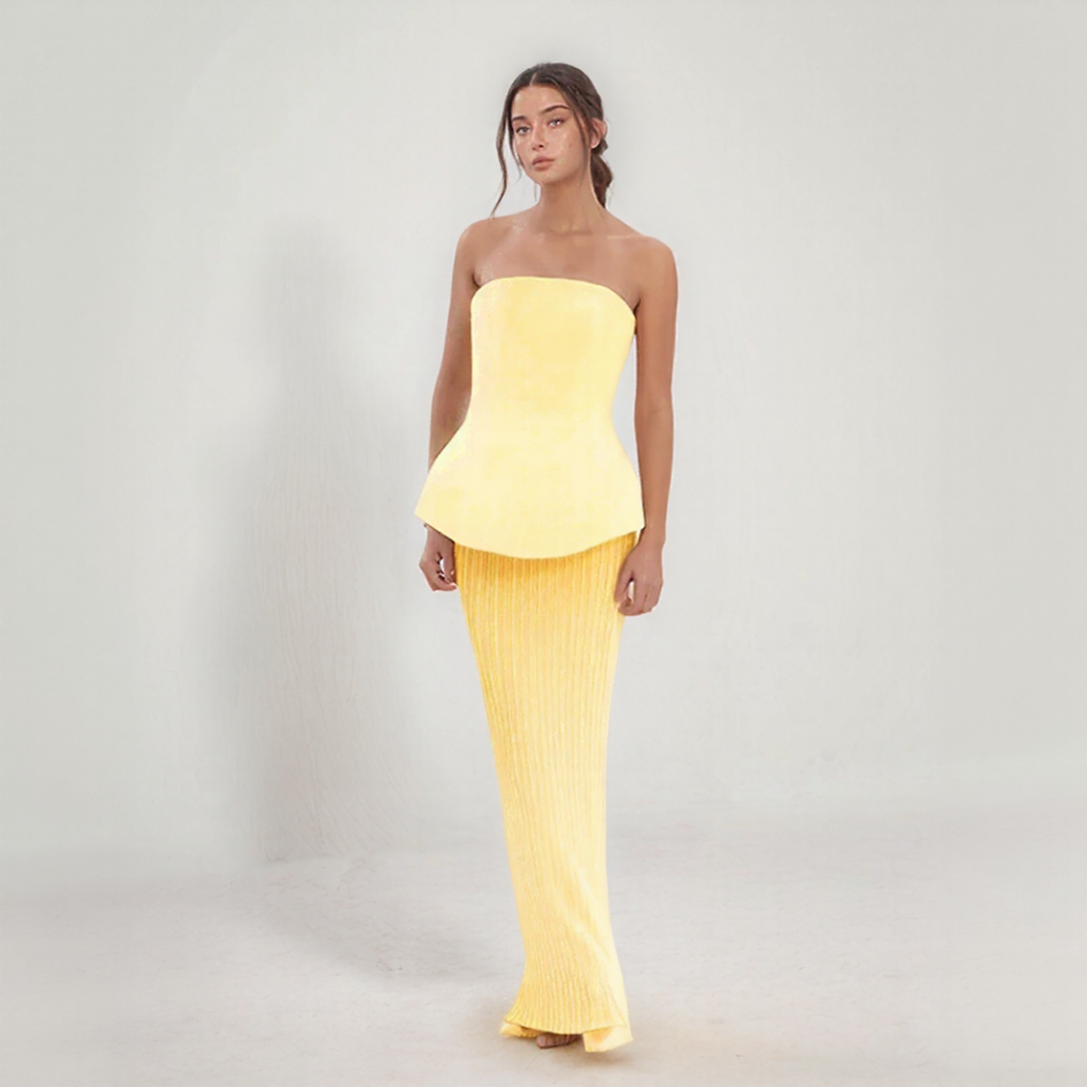 Questo completo abbina un crop top senza spalline che esalta le spalle a una gonna lunga plissettata con un drappeggio fluido. Perfetto per le occasioni eleganti, unisce raffinatezza moderna e comfort per tutta la giornata.