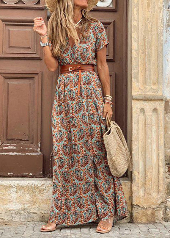 このボヘミアンロングドレスは繊細な花柄と流れるようなシルエットを持っています。Vネックと短い袖が女性らしく快適な印象を与えます。晴れた日にはぴったりで、スタイルと快適さを兼ね備えています。