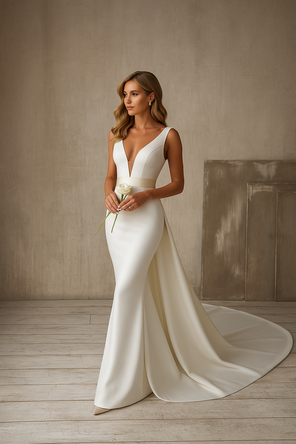 レイラ | スリーブレスVネックのロングウェディングドレスとトレイン