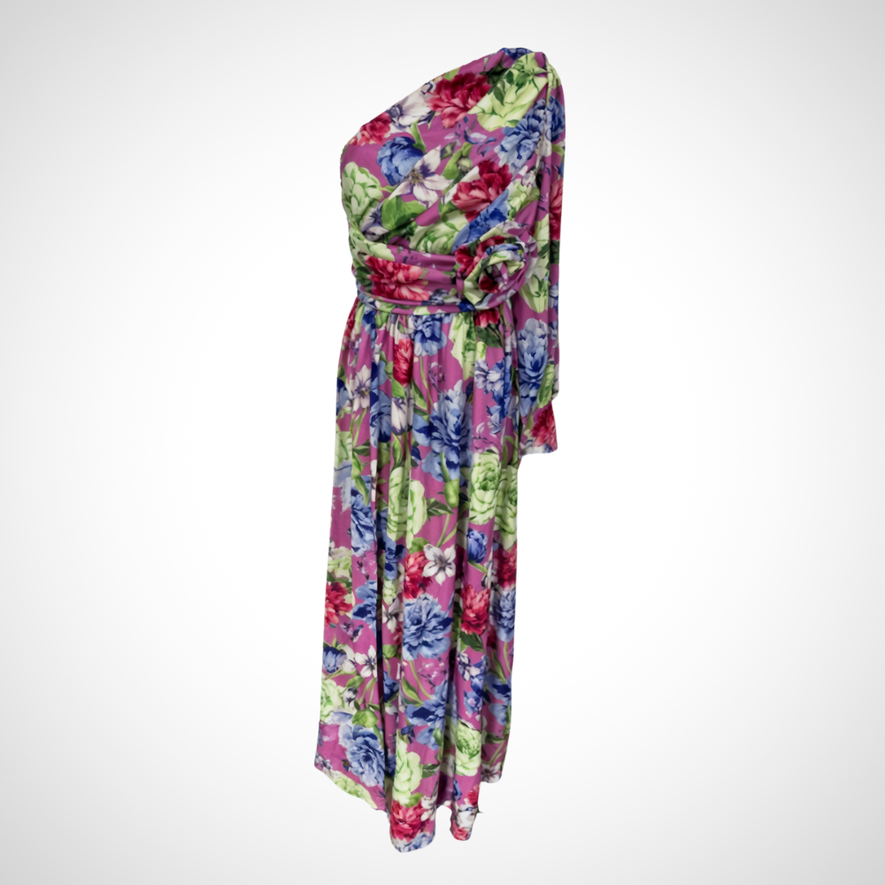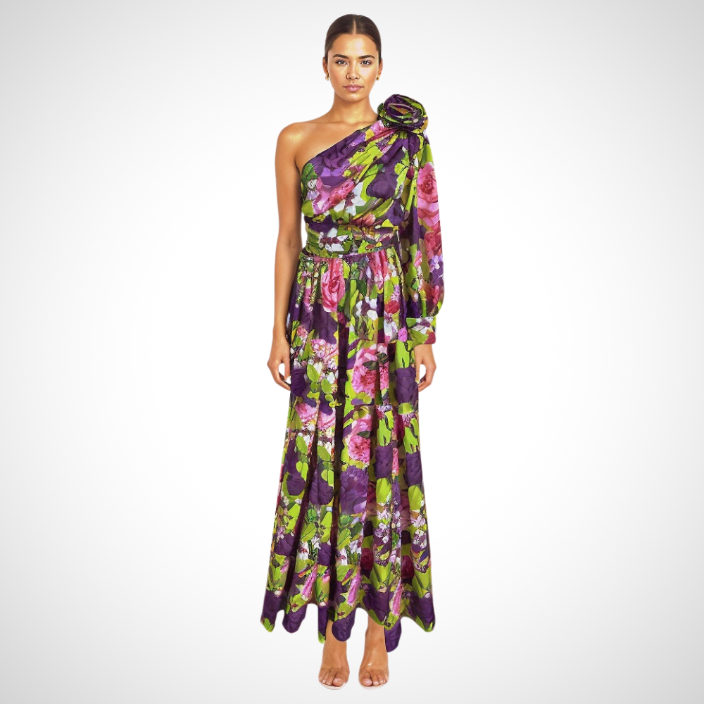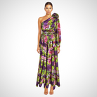 このアシンメトリックなロングドレスは、繊細に肩を露出させ、高い位置でデザインされています。流れるような裾と軽やかな生地が、暑い日でも理想的な快適さを提供します。夏にエレガントで大胆な印象を与えるのに最適です。