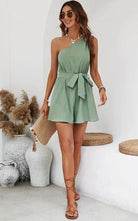 この片肩のショートオールは、モダンで洗練されたカットを提供します。暑い日にはぴったりで、快適さとスタイルを兼ね備えています。アシンメトリーデザインがあなたのワードローブに独自のタッチを加えます。