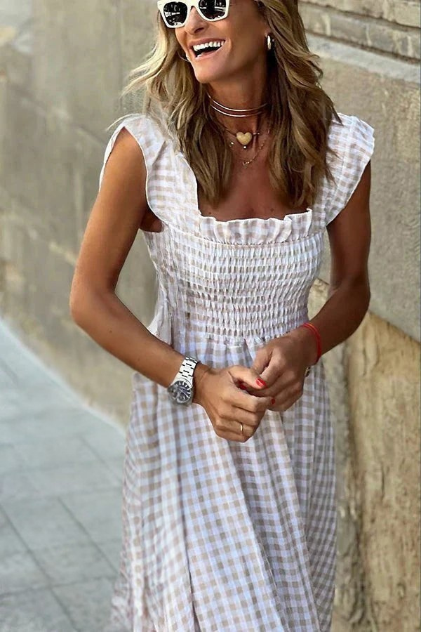 このチェック柄のドレスは、スモッキングウエストでエレガントにシルエットを引き立てます。流れるようなカットは最適な快適さを提供し、日常使いにもフォーマルな場面にも理想的です。スタイルと軽やかさの完璧なバランス。