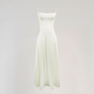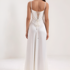 Denne lange kjolen fremhever silhuetten takket være sitt korsett-liknende liv som delikat fremhever midjen. Den flytende snittet gir bevegelse og eleganse, mens det korsett-liknende ryggen tilfører et romantisk og strukturert preg. Ideell for kvelder, gallaer eller seremonier.