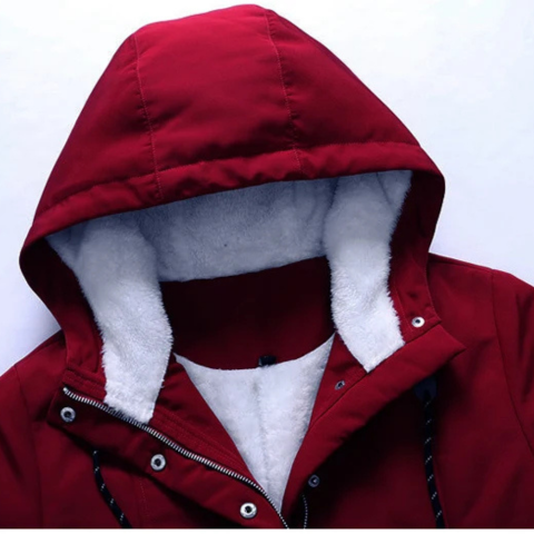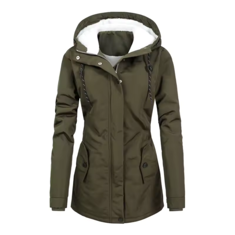 Ta długa kurtka podkreśla sylwetkę dzięki dopasowanemu krojowi i ustrukturyzowanej linii. Kaptur ze sznurkiem dodaje praktyczności, chroniąc przed chłodnymi dniami. Zapięcie na guziki z przodu dopełnia wygląd, jednocześnie pozwalając na przechowywanie najważniejszych rzeczy w zasięgu ręki.