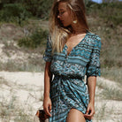 Ta długa sukienka ma dekolt w kształcie litery V i długie rękawy, rysując płynny i kobiecy kształt. Jej kolorowy wzór inspirowany kulturą aztecką dodaje oryginalności, pozostając jednocześnie delikatnym. Idealna na ceremonię, łączy w sobie komfort i wyrafinowanie w doskonały sposób.